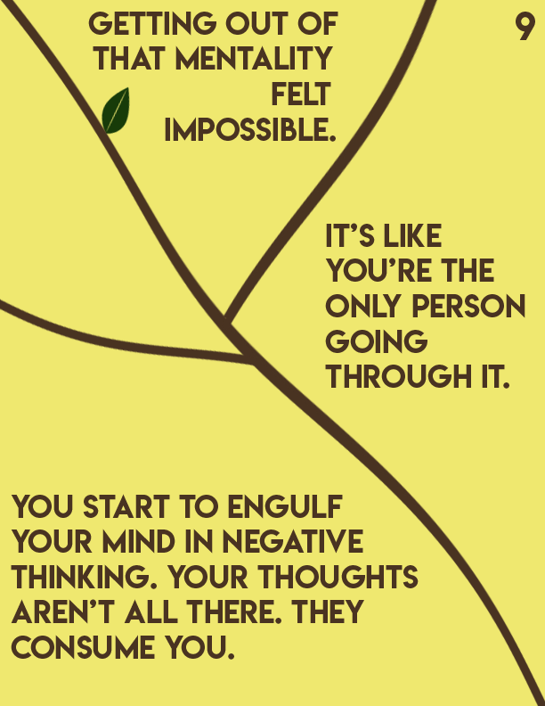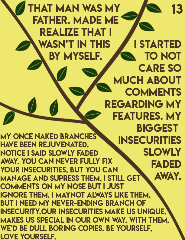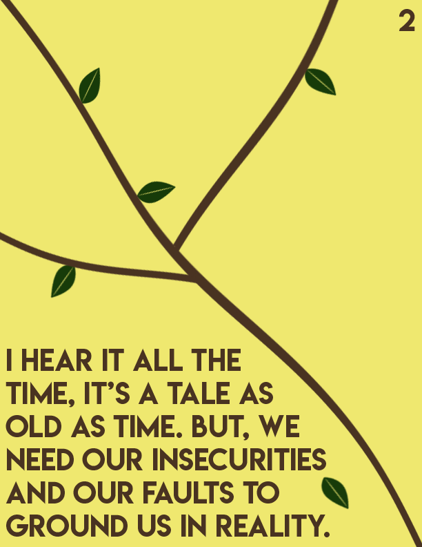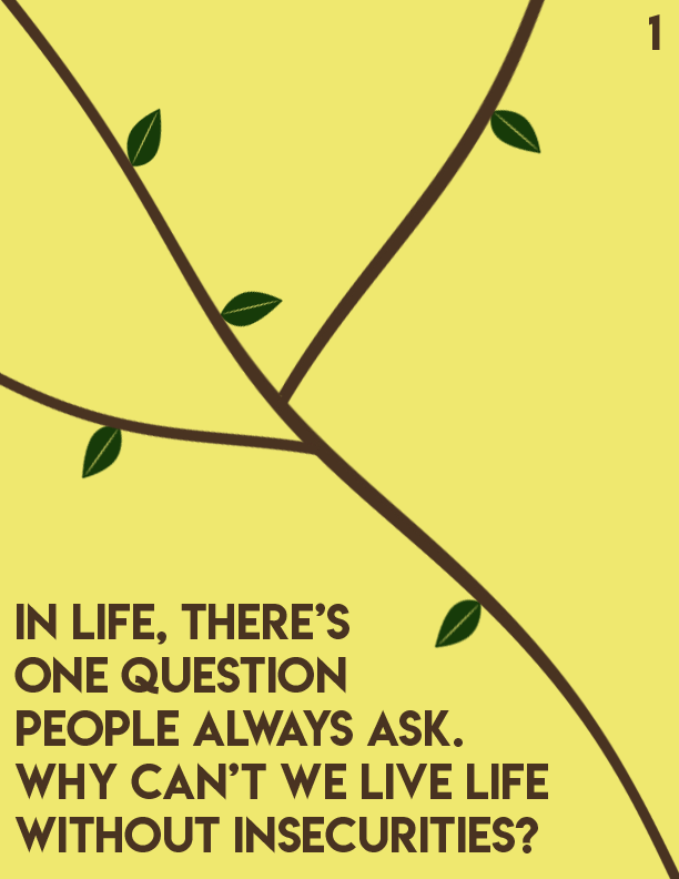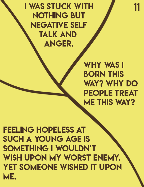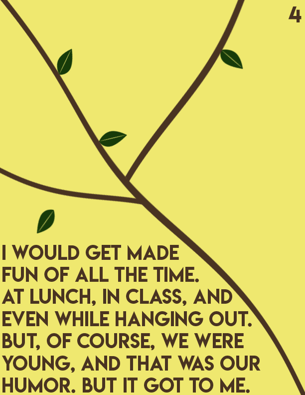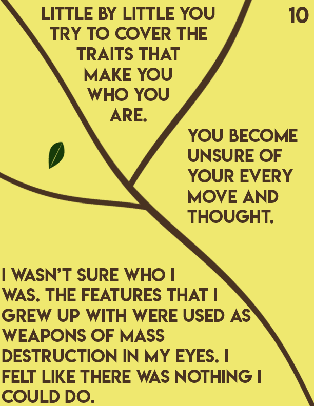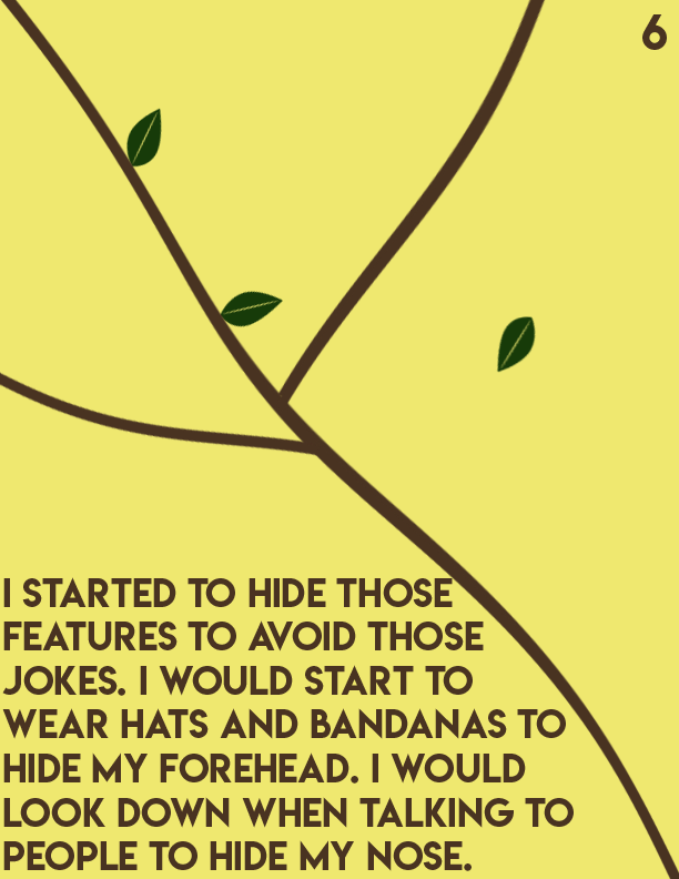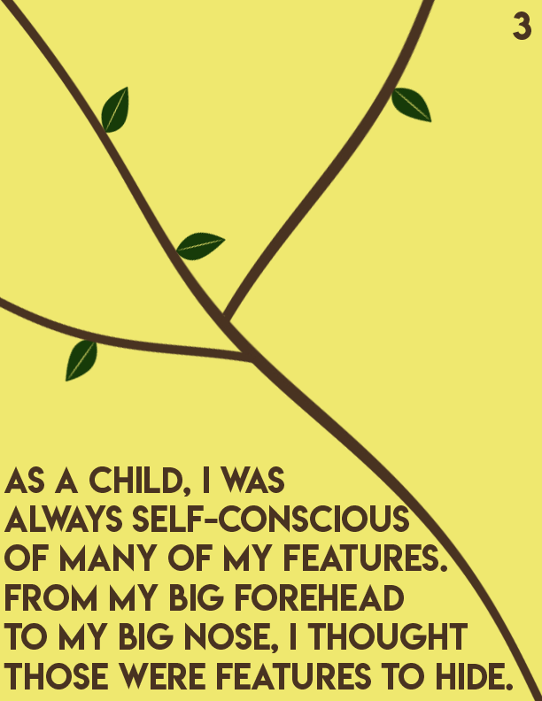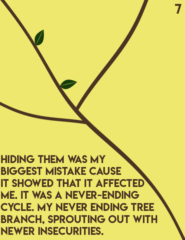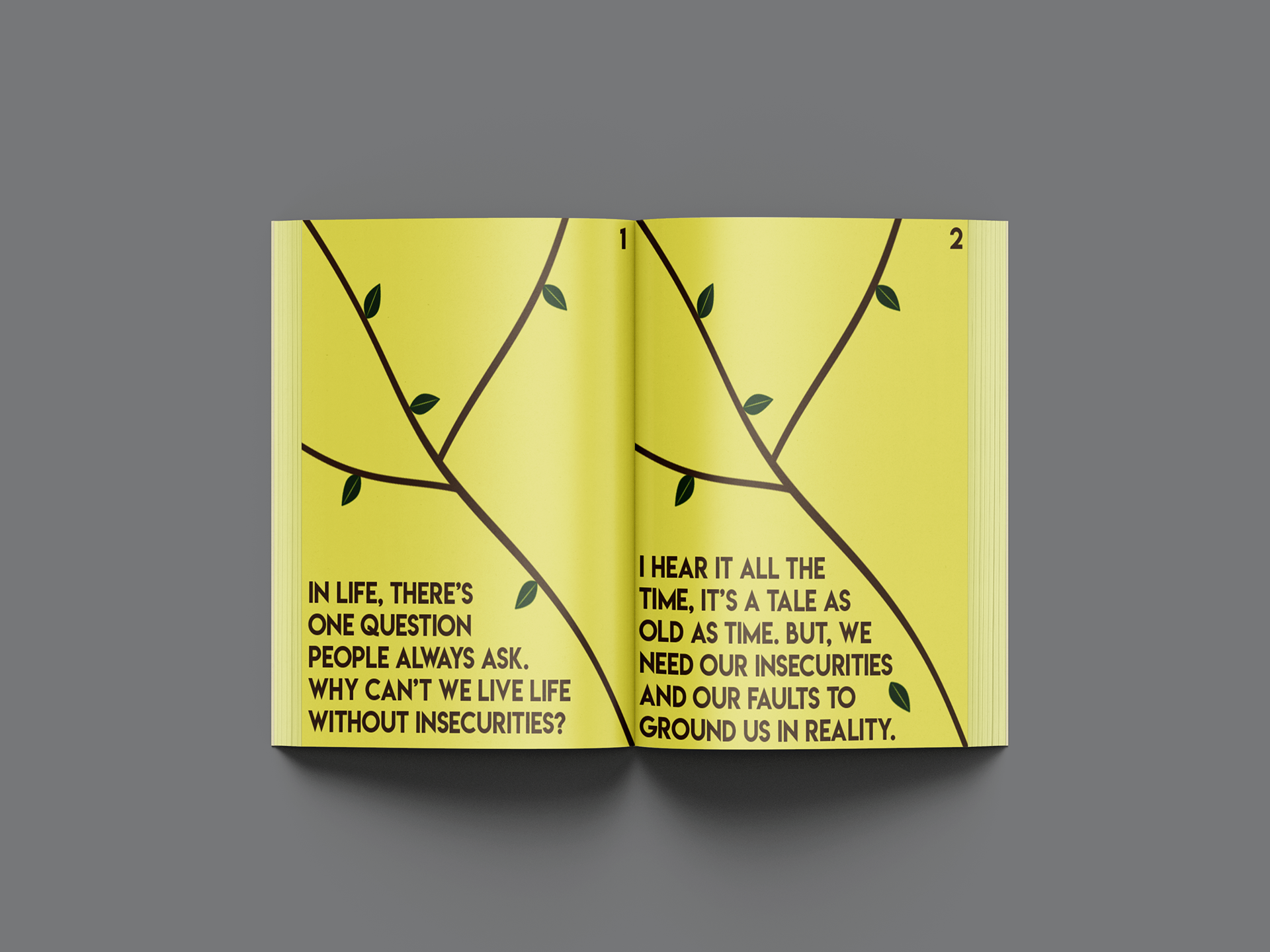 An editorial passion project centered around Dealing with insecurities as you age and develop into adulthood. I centered this story towards pre-teens and teenagers as it's a prominent issue in that particular age group. I made yellow pages to symbolize healing and happiness, while brown symbolizes strength. Towards the end of the book, the text breaks into different fragments by different tree branches.